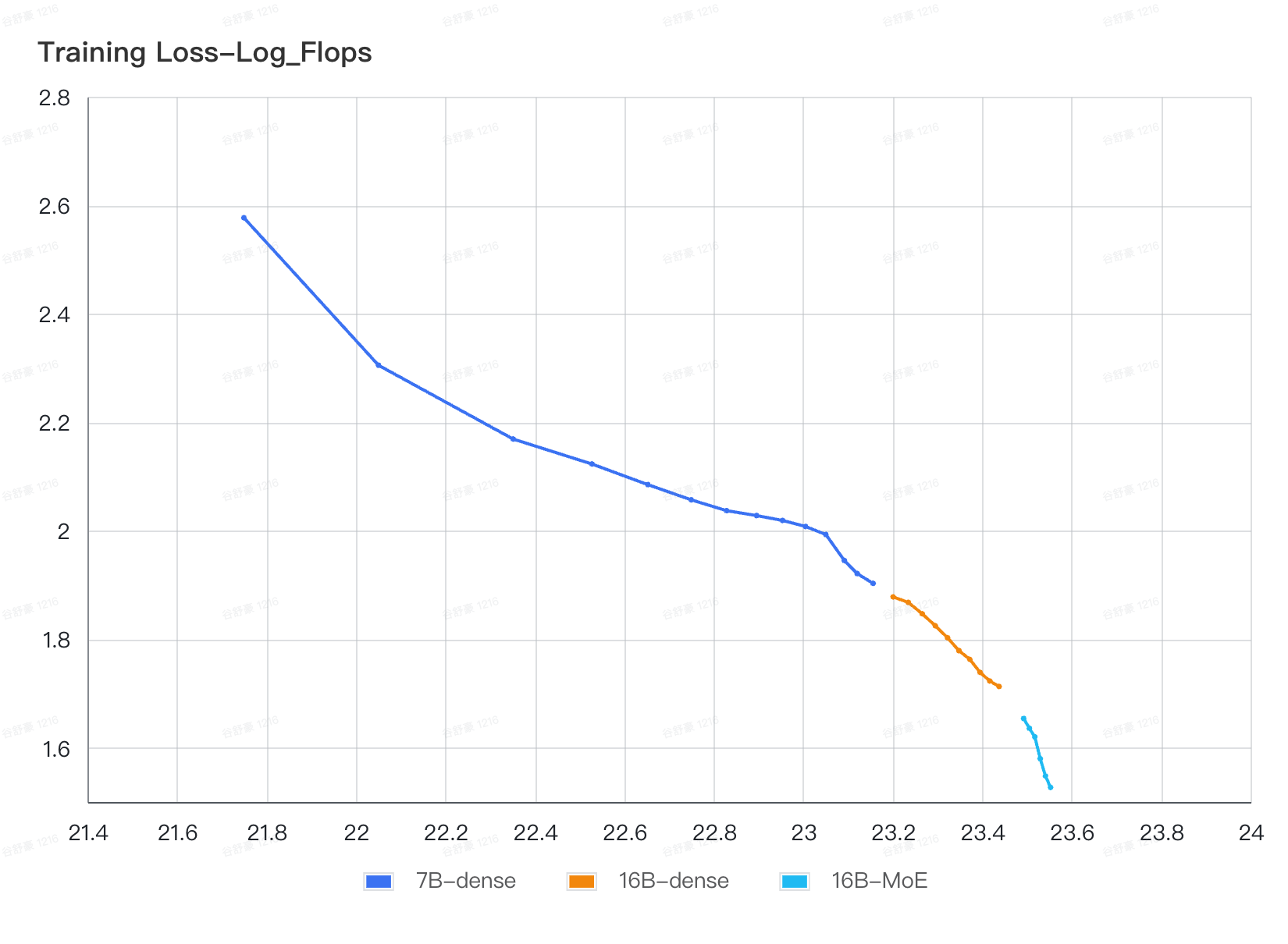 - Each Stage's Decrease: Throughout the training process, we observe a steady decrease in training loss as log FLOPs increase for each stage. The AquilaDense-7B (blue line) stage shows a gradual reduction in loss, followed by the AquilaDense-16B (orange line) stage, which continues the trend.