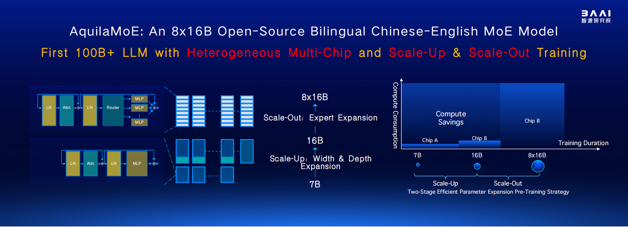 - MoE Weight Initialization: Aquila-MoE is initialized using Sparse Upcycling [4, 5]. The dense model's MLP layers are replaced with MoE layers, exact replicas of the original, with router parameters initialized normally (mean = 0, variance = 0.02).