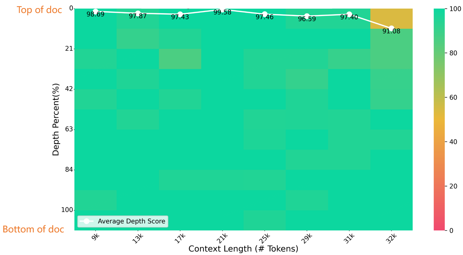 In a 32K-length needle-in-a-haystack test, Index-1.9B-32K achieved excellent results, as shown in the figure below. The only exception was a small yellow spot (91.08 points) in the region of (32K length, 10% depth), with all other areas performing excellently in mostly green zones.
