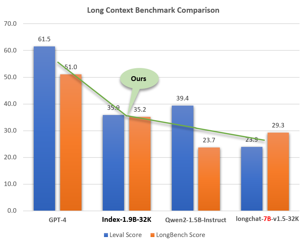 Despite its small size (about 2% of models like GPT-4), Index-1.9B-32K demonstrates excellent long-text processing capabilities. As shown in the figure below, our 1.9B-sized model's score even surpasses that of the 7B-sized model. Below is a comparison with models like GPT-4 and Qwen2: