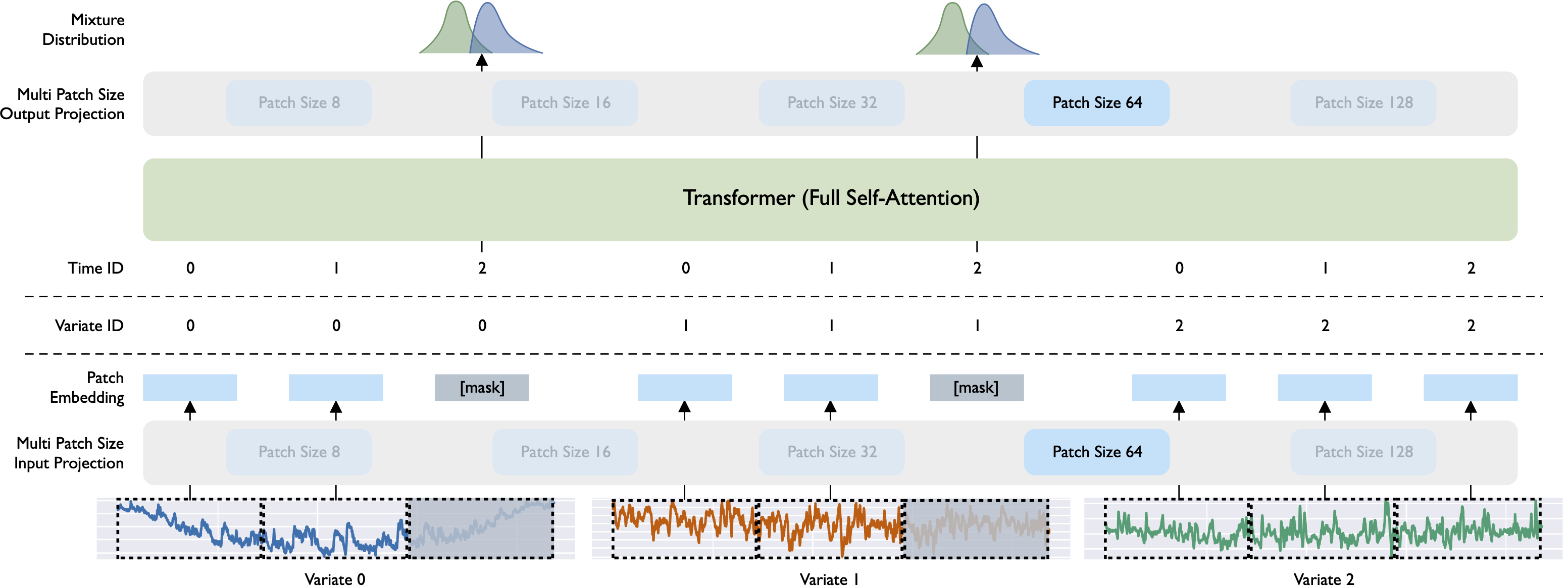 Fig. 1: Overall architecture of Moirai. Visualized is a 3-variate time series, where variates 0 and 1 are target variables (i.e. to be forecasted, and variate 2 is a dynamic covariate (values in forecast horizon known). Based on a patch size of 64, each variate is patchified into 3 tokens. The patch embeddings along with sequence and variate id are fed into the Transformer. The shaded patches represent the forecast horizon to be forecasted, whose corresponding output representations are mapped into the mixture distribution parameters.