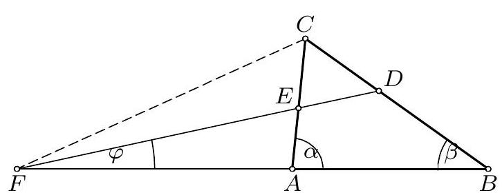 {"year": "2009", "tier": "T2", "problem_label": "1", "problem_type": null, "problem": "Нека су $\\alpha$ и $\\beta$ углови неједнакокраког троугла $A B C$ код темена $A$ и $B$, редом. Нека симетрале ових углова секу наспрамне странице троугла у $D$ и $E$, редом. Доказати да оштар угао између правих $D E$ и $A B$ није већи од $\\frac{|\\alpha-\\beta|}{3}$.\n\n(Душан Ђукић)", "solution": "Као и обично, означимо $\\varangle A C B=\\gamma$ и $B C=a, C A=b, A B=c$, при чему је без смањења општости $a>b$ и $\\alpha>\\beta$. Нека је $F$ тачка пресека правих $D E$ и $A B$, а $\\varphi$ угао између ових правих. Из односа $\\frac{B D}{D C}=\\frac{c}{b}$ и $\\frac{C E}{E A}=\\frac{a}{c}$ лако налазимо $B D=\\frac{a c}{b+c}, D C=\\frac{a b}{b+c}$, $C E=\\frac{a b}{a+c}$ и $E A=\\frac{b c}{a+c}$. Менелајева теорема за праву $D E$ и троугао $A B C$ даје $A F=\\frac{b c}{a-b}$ и $F B=\\frac{a c}{a-b}$.\n\n\n\nСада на основу синусне теореме у троугловима $F E A$ и $F D B$ имамо\n\n$$\n\\begin{aligned}\n& \\frac{\\sin (\\alpha-\\varphi)}{\\sin \\varphi}=\\frac{\\sin \\varangle F E A}{\\sin \\varangle E F A}=\\frac{F A}{E A}=\\frac{\\frac{b c}{a-b}}{\\frac{b c}{a+c}}=\\frac{a+c}{a-b} \\\\\n& \\frac{\\sin (\\beta+\\varphi)}{\\sin \\varphi}=\\frac{\\sin \\varangle F D B}{\\sin \\varangle D F B}=\\frac{F B}{D B}=\\frac{\\frac{a c}{a-b}}{\\frac{a c}{b+c}}=\\frac{b+c}{a-b}\n\\end{aligned}\n$$\n\nиз чега добијамо $\\sin \\varphi=\\sin (\\alpha-\\varphi)-\\sin (\\beta+\\varphi)=2 \\sin \\frac{\\alpha-\\beta-2 \\varphi}{2} \\cos \\frac{\\alpha+\\beta}{2}<$ $\\sin (\\alpha-\\beta-2 \\varphi)$. Одавде је $\\varphi<\\alpha-\\beta-2 \\varphi$, тј. $3 \\varphi<\\alpha-\\beta$.", "metadata": {"resource_path": "Serbia_MO/segmented/sr-2009_smo_resenja.jsonl", "problem_match": "\n1. ", "solution_match": "\n1. "}}