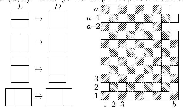 {"year": "2018", "tier": "T2", "problem_label": "5", "problem_type": null, "problem": "Нека су $a$ и $b$ непарни природни бројеви већи од 1. Посматрајмо таблу $a \\times b$ којој недостају поља $(2,1),(a-2, b)$ и $(a, b)$ (под пољем $(i, j)$ подразумевамо поље у пресеку врсте $i$ и колоне $j$ ). Претпоставимо да је оваква табла поплочана помоћу $2 \\times 1$ домина и $2 \\times 2$ квадрата (домине се могу ротирати).\n\nДоказати да је употребљено бар $\\frac{3}{2}(a+b)-6$ домина. (Никола Петровић)", "solution": "Упишимо у поље $(i, j)$ број $(-1)^{i+j}(i+j)$. Збир уписаних бројева у читавој таблици је $\\sum_{i=1}^{a}(-1)^{i} \\sum_{j=1}^{b}(-1)^{j}(i+j)=\\sum_{i=1}^{a}(-1)^{i+1}\\left(i+\\frac{b+1}{2}\\right)=\\frac{a+b+2}{2}$, а ако се три наведена поља избаце, збир у остатку таблице је\n\n$$\n\\frac{a+b+2}{2}-(-3)-(a+b-2)-(a+b)=-\\frac{3}{2}(a+b)+6\n$$\n\nКако је збир бројева у сваком квадрату $2 \\times 2$ једнак нули, а збир у свакој домини је 1 или -1 , потребно је бар $\\frac{3}{2}(a+b)-6$ домина.\n\nДруго решеъе. Нека су врсте и колоне нумерисане одоздо нагоре и слева надесно. Можемо да сматрамо да се у поплочавању не појављује ниједна од целина означених са $L$ на слици - заиста, оне се могу заменити одговарајућим целинама означеним са $D$, притом не повећавајући број домина.\n\nРазмотримо фигуру која покрива поље $(a, 1)$. Ако је то нпр. хоризонтална домина $(a, 1)-(a, 2)$ (аналогно се испитује случај вертикалне домине), онда поље $(a-1,1)$ не може бити покривено ни квадратом ни хоризонталном домином (јер би они са горњом домином градили једну од целина $L$ ), па оно мора бити покривено вертикалном домином $(a-1,1)-(a-2,1)$. Слично, сада поље $(a-1,2)$ мора би-\n\nти покривено домином $(a-1,2)-(a-1,3)$, итд. до бесконачности, што је немогуће. Према томе, фигура која покрива поље $(a, 1)$ је квадрат.\n\nНа сличан начин, поља $(a, 3)$ и ( $a-2,1$ ) су такође покривена квадратима, затим поља $(a, 5),(a-2,3)$ и ( $a-4,1)$, итд. Настављајући овај поступак, закључујемо да су сва поља осим оних у врстама $1,2,3$ и оних у колонама $b-2, b-1, b$ покривена квадратима. Преостала поља се могу поплочати на једниствен начин, приказан на слици, што се директно проверава. При томе је употребљено тачно $\\frac{3}{2}(a+b)-6$ домина.\n\nTреће решење. Обојићемо поља табле црно и бело попут шаховске табле. Праву која раздваја $i$-ту и $(i+1)$-ву врсту/колону зовемо $i$-том хоризонталом/вертикалом.\n\nАко је $j$ парно ( $2 \\leqslant j \\leqslant b-1$ ), бар једна (хоризонтална) домина сече $j$-ту вертикалу јер је број поља у првих $j$ колона непаран. С друге стране, ако је $j$ непарно $(1 \\leqslant j \\leqslant b-2$ ), бар две домине морају сећи $j$-ту вертикалу јер у првих $j$ колона има за два више црних поља него белих. Овако добијамо бар $\\frac{3 b-3}{2}$ хоризонталних домина.\n\nСлично, ако је $i$ парно ( $2 \\leqslant i \\leqslant a-3)$ или $i \\in\\{1, a-2\\}$, бар једна (вертикална) домина сече $i$-ту хоризонталу јер је број поља у првих $i$ врста непаран. С друге стране, ако је $i$ непарно ( $3 \\leqslant i \\leqslant a-4$ ), број црних поља у првих $i$\nврста је за два већи од броја белих, па бар две домине морају сећи $i$-ту хоризонталу. Овако добијамо бар $\\frac{3 a-9}{2}$ вертикалних домина.\n\nДакле, укупно има бар $\\frac{3 a-9}{2}+\\frac{3 b-3}{2}=\\frac{3}{2}(a+b)-6$ домина.", "metadata": {"resource_path": "Serbia_MO/segmented/sr-2018_smo_resenja.jsonl", "problem_match": "\n5. ", "solution_match": "\n5. "}}
