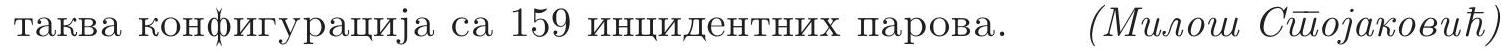 {"year": "2011", "tier": "T2", "problem_label": "6", "problem_type": null, "problem": "Скуп $T$ садржи 66 тачака, а скуп $P$ садржи 16 правих у равни. За тачку $A \\in T$ и праву $l \\in P$ кажемо да су иниидентни пар ако $A \\in l$. Доказати да број инцидентних парова не може бити већи од 159 , као и да постоји\n\n\n\nВреме за рад 270 минута.\n\nСваки задатак вреди 7 поена.\n\n## РЕШЕЊА", "solution": "Означимо са $A_{1}, \\ldots, A_{66}$ тачке скупа $T$ и са $a_{i}$ број правих из $P$ које садрже $A_{i}$. Тада је број парова правих које се секу у $A_{i}$ једнак $\\binom{a_{i}}{2}$, а број инцидентних парова $I=\\sum a_{i}$. Како се сваке две праве секу у највише једној тачки, важи $\\sum_{i=1}^{66}\\binom{a_{i}}{2} \\leqslant\\binom{ 16}{2}=120$. Нека је $b_{k}$ број тачака из $T$ кроз које пролази тачно $k$ правих из $P$. Тада је $\\sum b_{k}=66, \\sum\\binom{k}{2} b_{k} \\leqslant 120$ и $I=\\sum k b_{k} \\leqslant \\sum \\frac{1}{2}\\left(3+\\binom{k}{2}\\right) b_{k}=\\frac{1}{2}(3 \\cdot 66+120)=159$, јер је $3+\\binom{k}{2} \\geq 2 k$. Једнакост се достиже ако је $b_{k}=0$ за $k \\notin\\{2,3\\}, b_{2}=39$ и $b_{3}=27$, другим речима, ако праве из $P$ одређују тачно 39 двоструких и 27 троструких пресека.\n\nПример конфигурације са 159 инцидентних парова може се конструисати нпр. помоћу Дезаргове теореме. Узмимо тачке $A_{1}, A_{2}, A_{3}$ на правој $a$ и $B_{1}, B_{2}, B_{3}$ на правој $b \\| a$, затим повуцимо 9 правих $A_{i} B_{j}, i, j \\in\\{1,2,3\\}$. Нпр. на слици је $A_{1} A_{2}: A_{2} A_{3}: B_{1} B_{2}: B_{2} B_{3}=2: 2: 3: 6$, тако да међу овим правим нема паралелних. По Дезарговој теореми, ових 9 правих одређују 18 пресечних тачака које су по три колинеарне - тако да одређују још 6 правих. Заједно са ових 6 правих, имамо слику са 15 правих и 24 трострука пресека. При том се три праве добијене Дезарговом теоремом секу у једној тачки (на слици тачка $K$ ), што нам даје и 25 -ти троструки пресек. Повуцимо још једну праву која пролази само кроз две двоструке пресечне тачке. За скуп $P 16$ нацртаних правих и скуп $T$ који се сас-\n\n\nтоји од 27 добијених троструких и преосталих 39 двоструких пресека постиже се једнакост.", "metadata": {"resource_path": "Serbia_MO/segmented/sr-2011_smo_resenja.jsonl", "problem_match": "\n6. ", "solution_match": "\n6. "}}