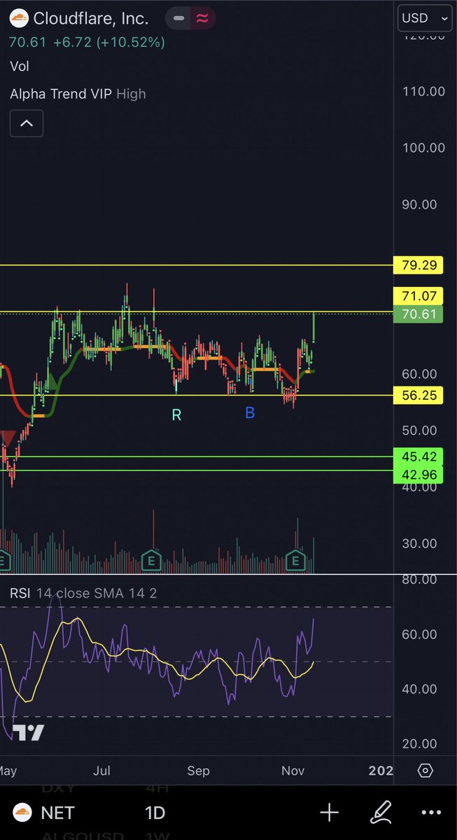 [{'ticker': '$NET', 'exchanges': [], 'price': '70.61', 'percentage_change': '+9.52%', '4h_ta_result': 'STRONG_BUY', '4h_ta_details': '16 buy, 9 hold, 1 sell', '1d_ta_result': 'STRONG_BUY', '1d_ta_details': '17 buy, 9 hold, 0 sell'}]