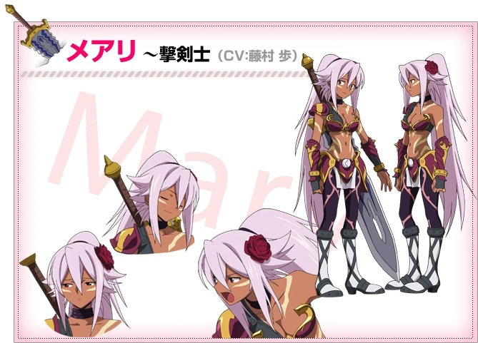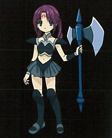 "Unless you also want to be stripped naked, get out of my face!" — Helluger — 'Maniac Helluger (狂おしきヘルルーガ) is a Chaotic PK in The World R:2. Helluger appears a dark skinned woman with short blond hair wrapped in bandages She wears fish net clothing and light shoulder armor. In the Japanese version of the game, she has a habit from switching Japanese words to English. Mary Lou Hirama (平間・メリールー) is a fifteen-year-old girl living in Sendai. Her mother is Japanese and her father is an American with
