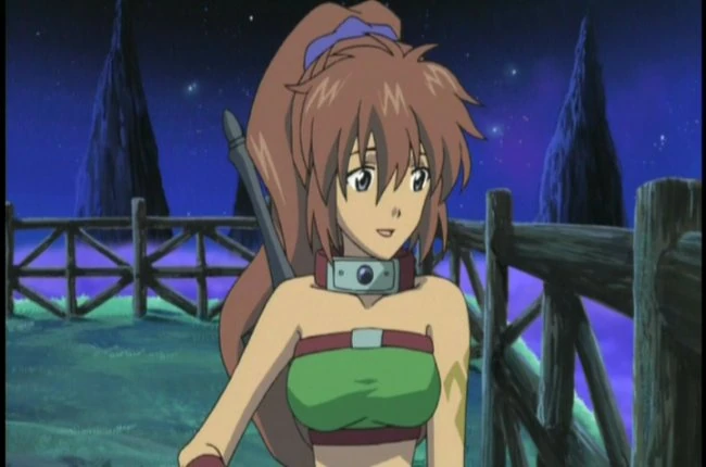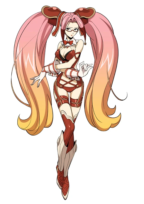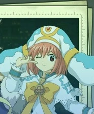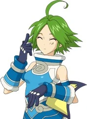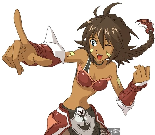 "You're my pal now! Nice to meet ya!" — Cocole — Cocole is a young lady with light pink hair divided in several braids, fair skin and green eyes.. She wears a kimono-shaped top, and red flared pants. Her staff has several rings, like a shakujo buddhist staff. Cocole is a very friendly person, rapidly befriending the player character of Guilty Dragon. She´s very energetic but also very pushy and unlucky, often complaining out loud. For some reason, she talks like an old lady. NAVICO often teases