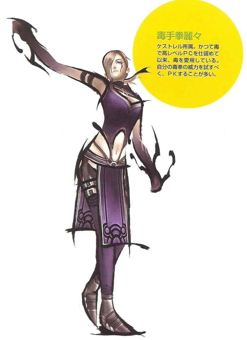 "Oh, a new guy, huh? You came at the right time. I was just testing my poison fist I just customised." — Lei Lei — Lei Lei (麗々) is a Chaotic PK with the title Poison Lei Lei . Lei Lei appears as a woman with blond hair wearing dark purple pants and loincloth, and a matching revealing shirt. She has a wave tattoo running down her cheek from the bottom of her eye, likely a poison themed motif of a bleeding eye, a common symbol in popular media. Lei Lei is obsessed with the poison status, possibly