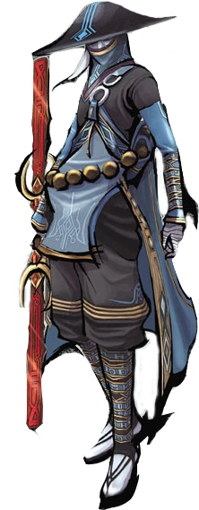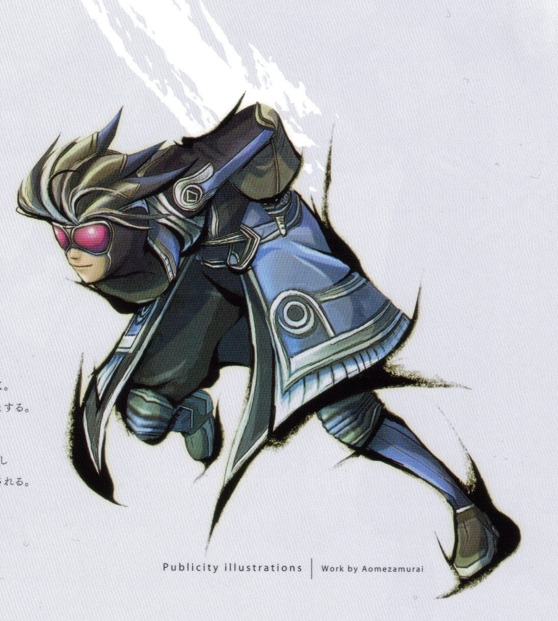 "This is my message... nose to the grindstone!" — Sophora — Sophora (槐, Enju, lit. "Pagoda Tree") is the Captain of Moon Tree's Sixth Division, the Healing Corps. Moon Tree's Division Six Captain is a tall character with a nearly androgynous appearance. Sophora has a ninja-like appearance fitting of the twin blade class, and is covered by a thief-like black and blue outfit, with a belt of beads around the waist. Sophora almost always wears a large face-covering black hat. Underneath the hat, Sop