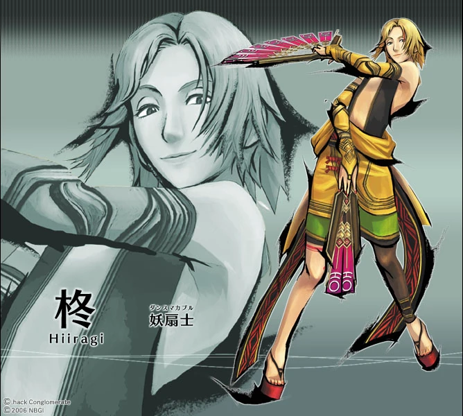 Hiiragi/Navigation "I really love nice guys, you know... But, of course, you should be careful! See, if you're too nice... It could be bad for your health!!" — Hiiragi — Hiiragi (柊, Hiiragi, lit. "Holly") is the Captain of Moon Tree's Fifth Division, and a passionate follower of Sakaki. Hiiragi's character is a young man sporting a Japanese-style yellow robe with a revealing top. He has medium length golden blonde hair with red streaked bangs. Hiiragi is often perceived as a male due to his char