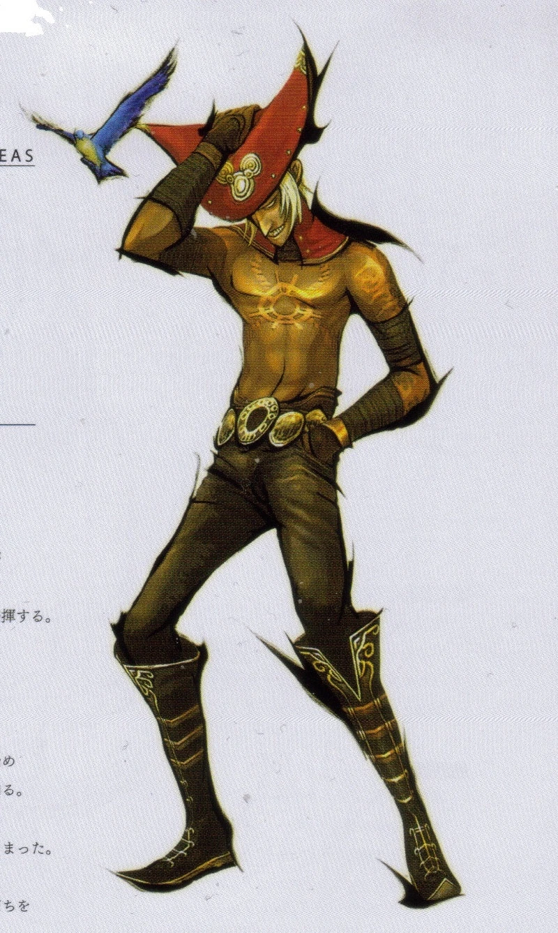 Yata (八咫, Yata) is a male Macabre Dancer and System Administrator dispatched to solve the problems plaguing The World R:2. He is also the Epitaph User titled "The Prophet" and has the ability to call forth Avatar Fidchell. Yata appears as a dark-skinned and powerfully built man. He is dressed in an extravagant outfit, most notably his Buddhist kasaya like robe, which leaves his lower legs and most of his chest bare. Most of his body, including his face is decorated with various wave tattoos and