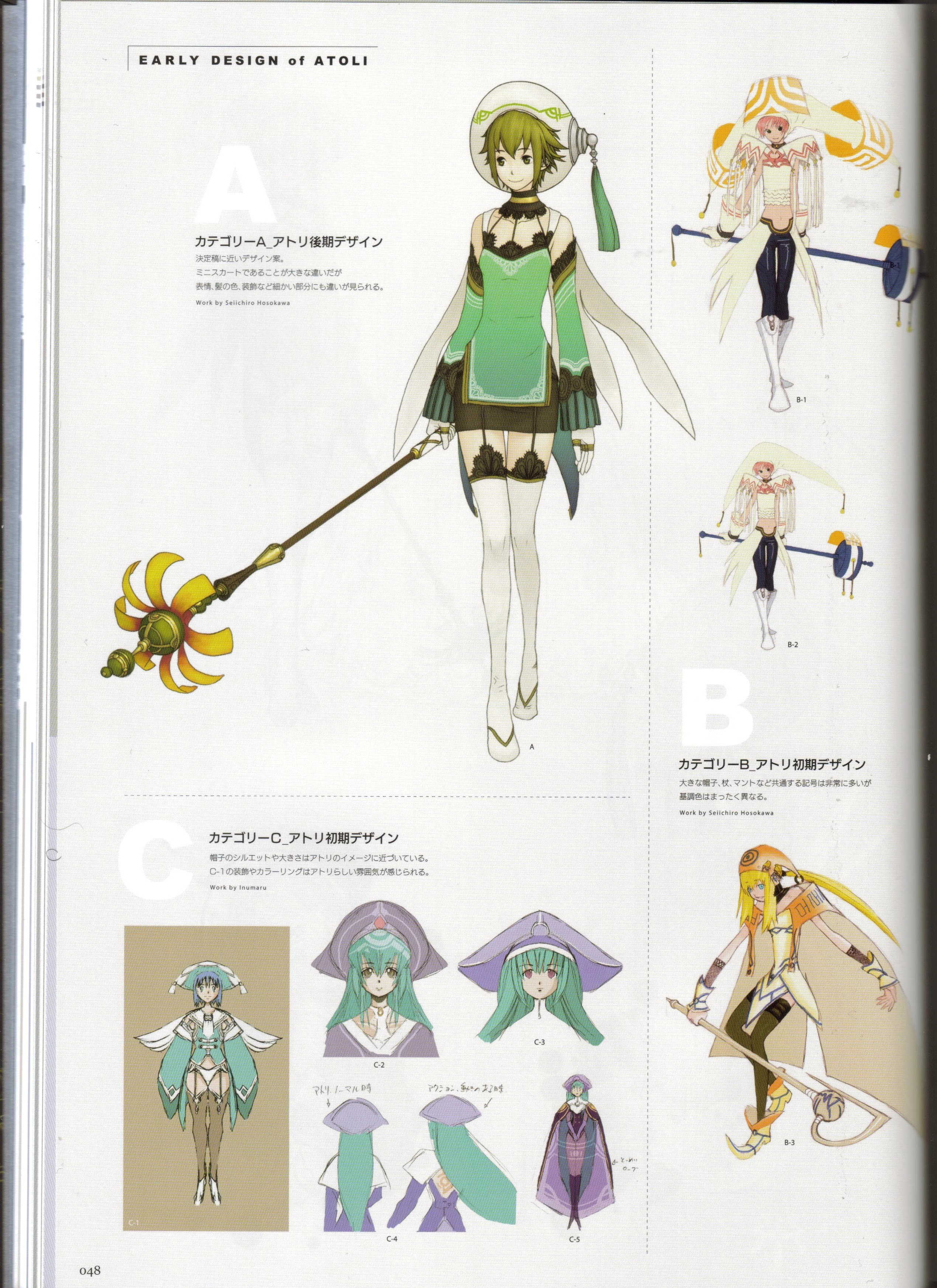 Atoli (アトリ, Atori, lit. "Brambling") is a female Harvest Cleric and a member of the guild called Moon Tree. She is also an Epitaph User, and is the host for the Second Phase Innis, the Mirage of Deceit. Atoli is almost an identical twin to Shino, due to sharing the same character model, the only differences being her hair color, and the lack of a teardrop shaped mark, along with a more colorful outfit. Her appearance is that of a young blonde woman. She wears a small green dress, a short white w