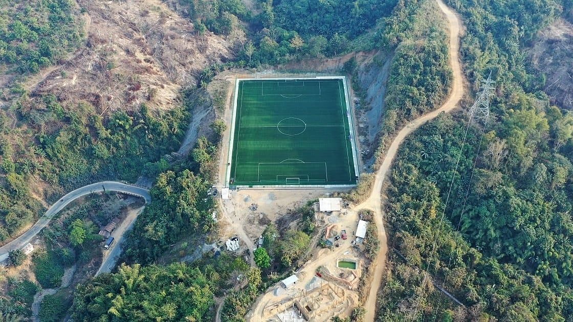 An aerial view of a {Structure} situated amidst nature, with {Surroundings} forming the backdrop.
