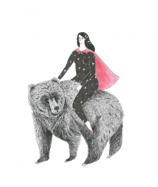 An artistic representation of {Superhero Costume} riding on top of a {Animal}.